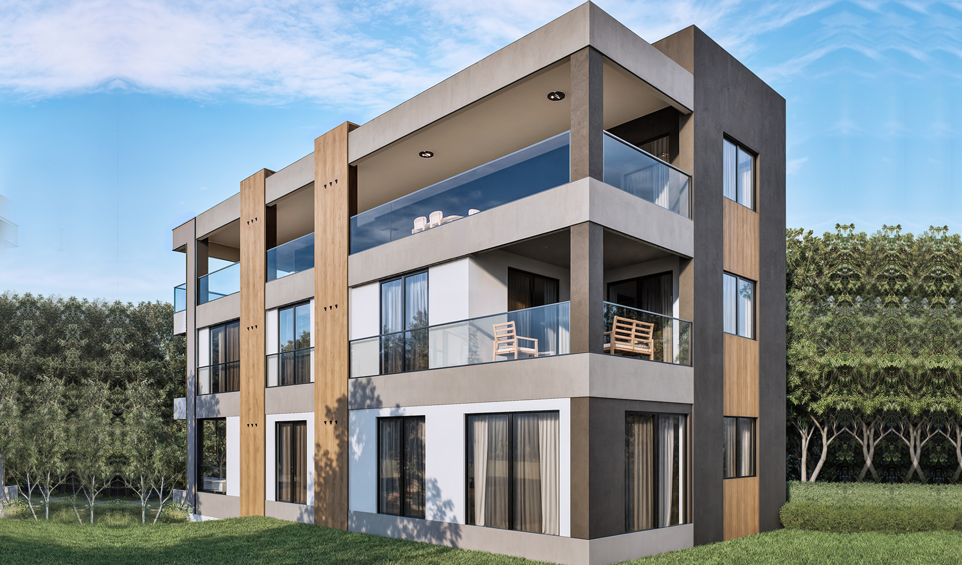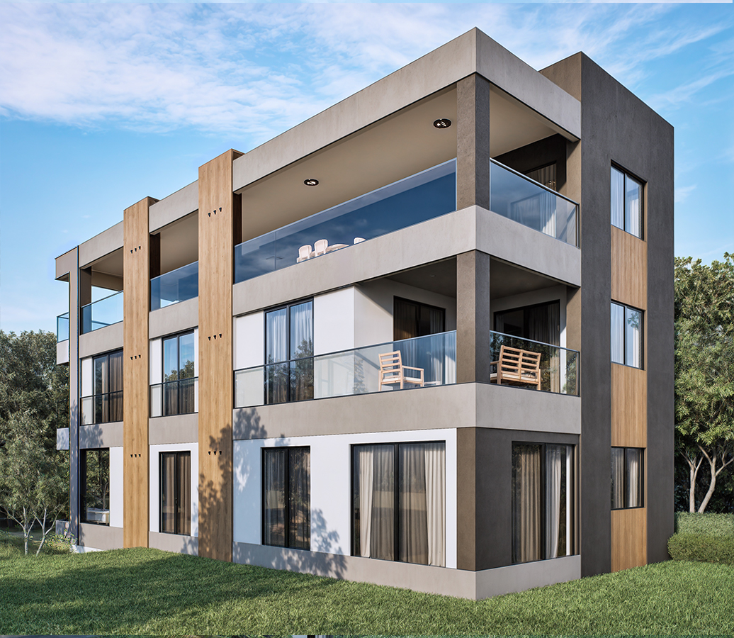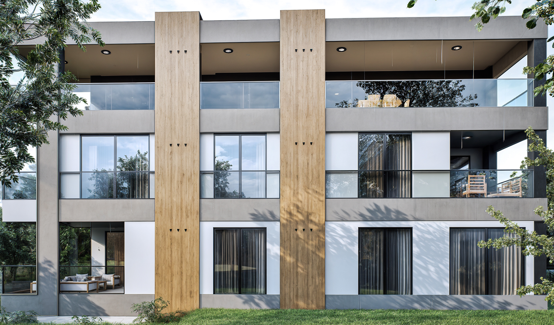 Proje, yatay ve dikey hatların dengeli bir şekilde kullanıldığı modern bir tasarıma sahip. Cephede, gri beton dokusu, ahşap paneller ve beyaz yüzeyler arasında şık bir kontrast oluşturulmuştur. Bu üçlünün uyumu, yapıya hem dinamik hem de zamansız bir estetik katıyor.